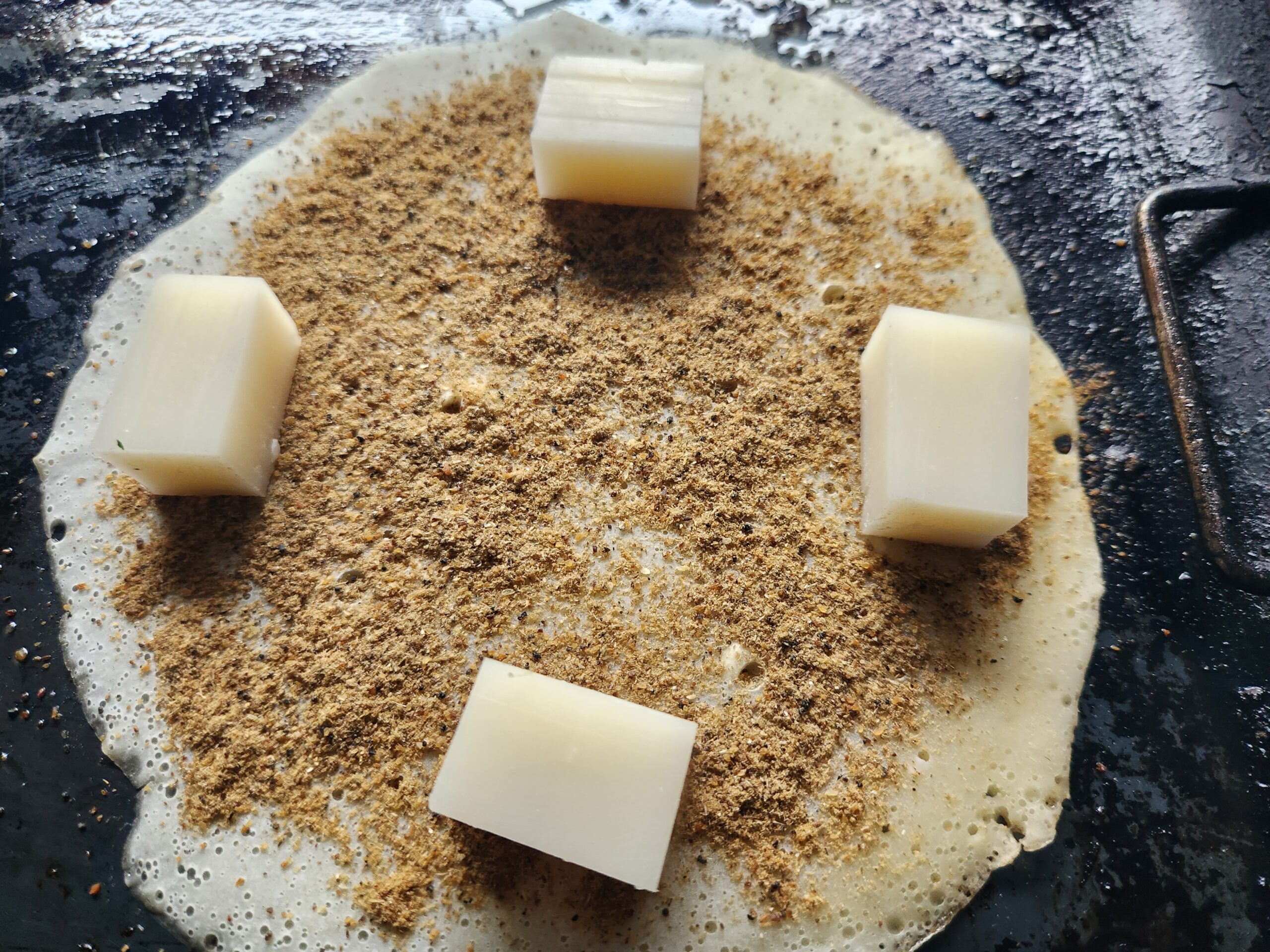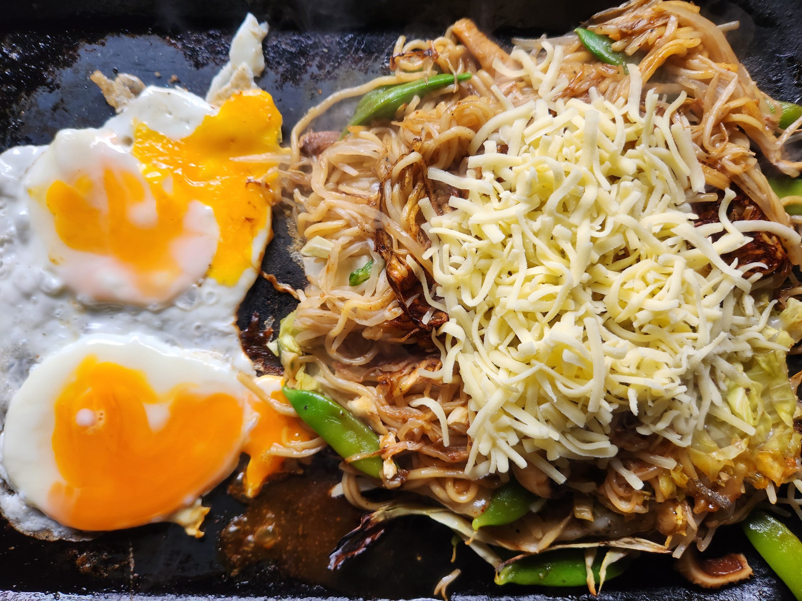 横で卵をやきはじめ半熟になったら、お好み焼きをひっくり返しそば面を上にします、チーズを乗せます。(チーズも私の好み、オプションです)