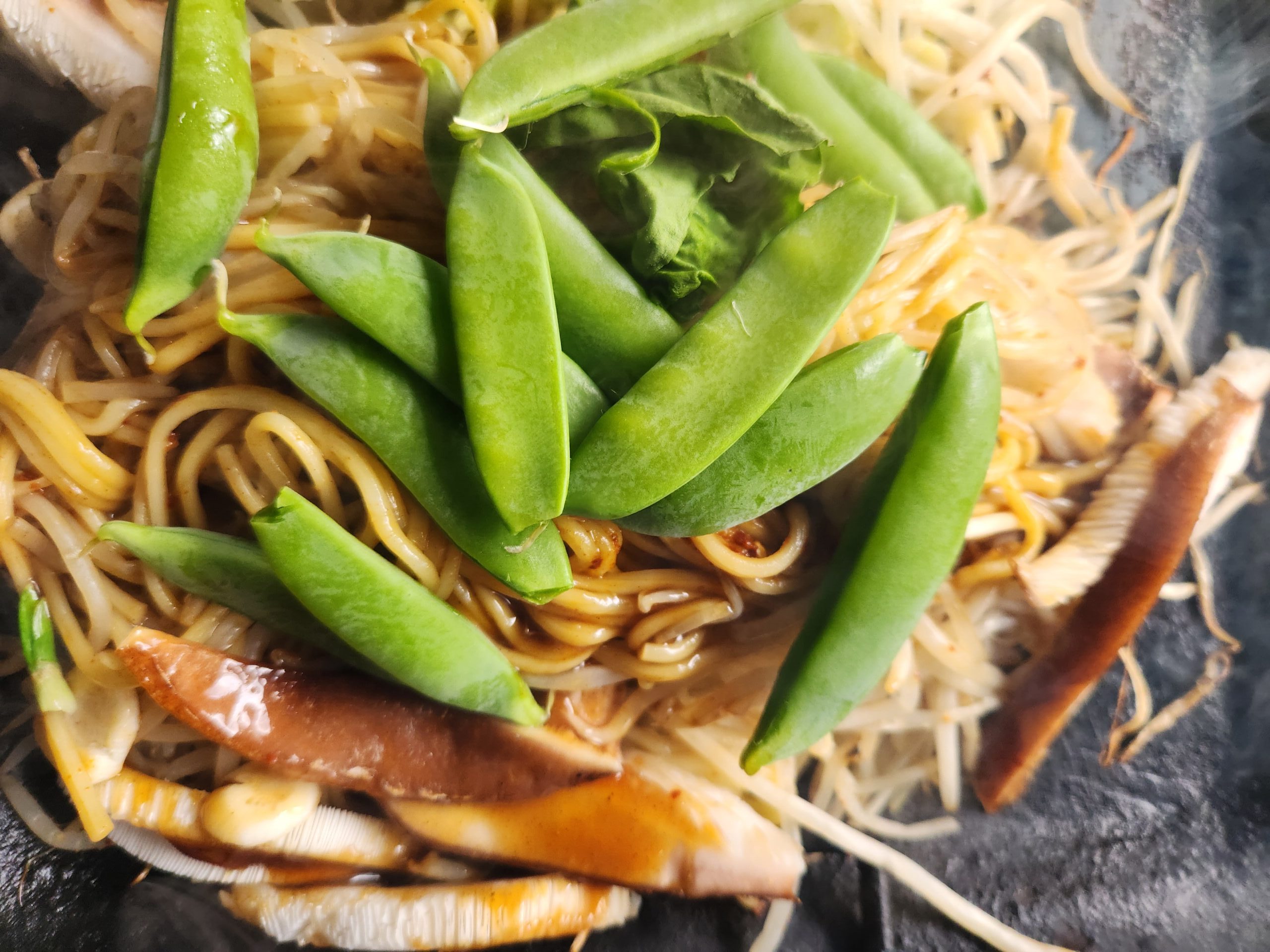 ニンニクを3片ほど切って入れ、今うちに生えてるえんどう豆と原木椎茸を入れました。