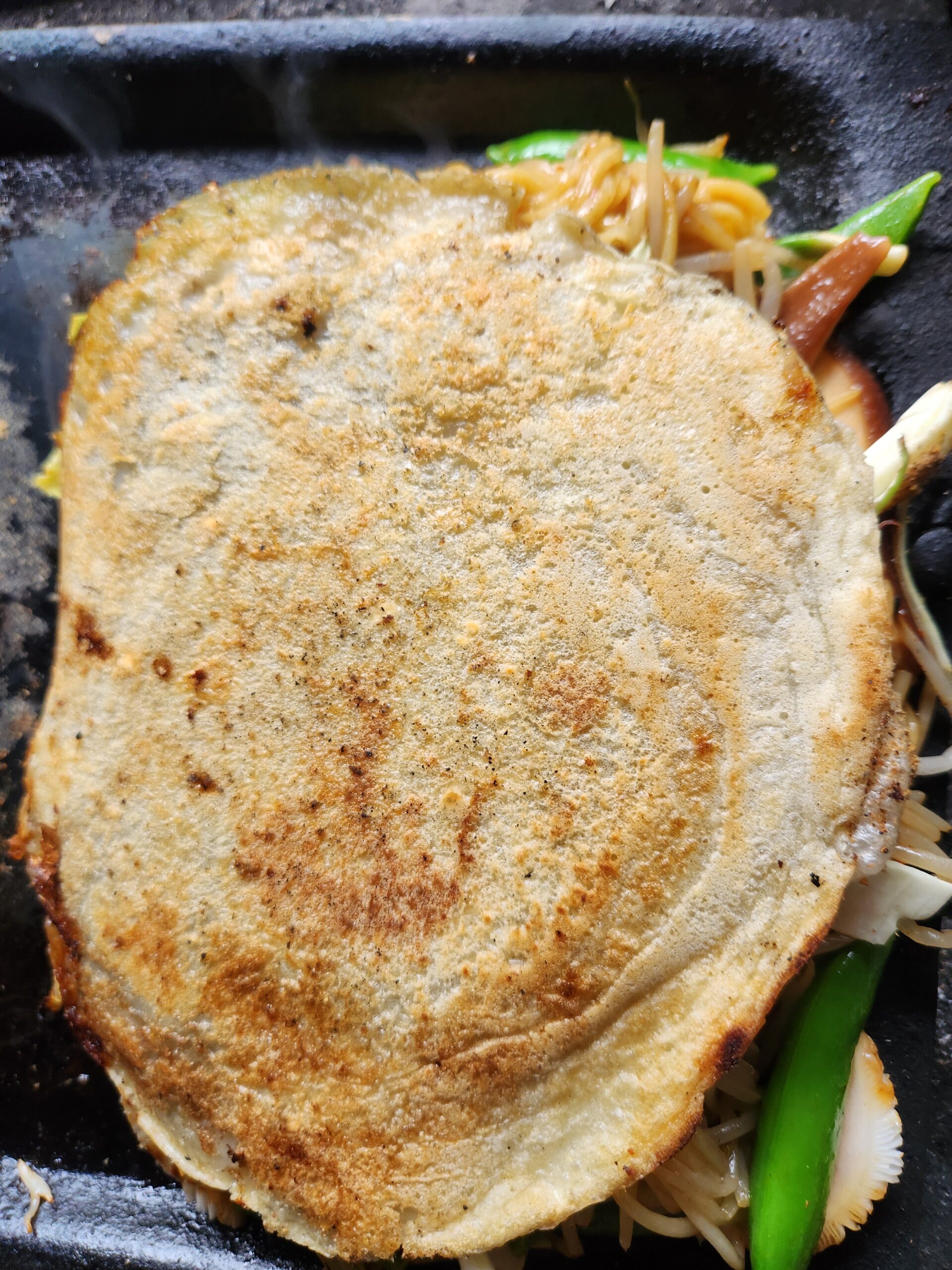 焼きそばが炒まったら、ヘラを2本使って皮とキャベツをひょいとソバの上に乗せます。