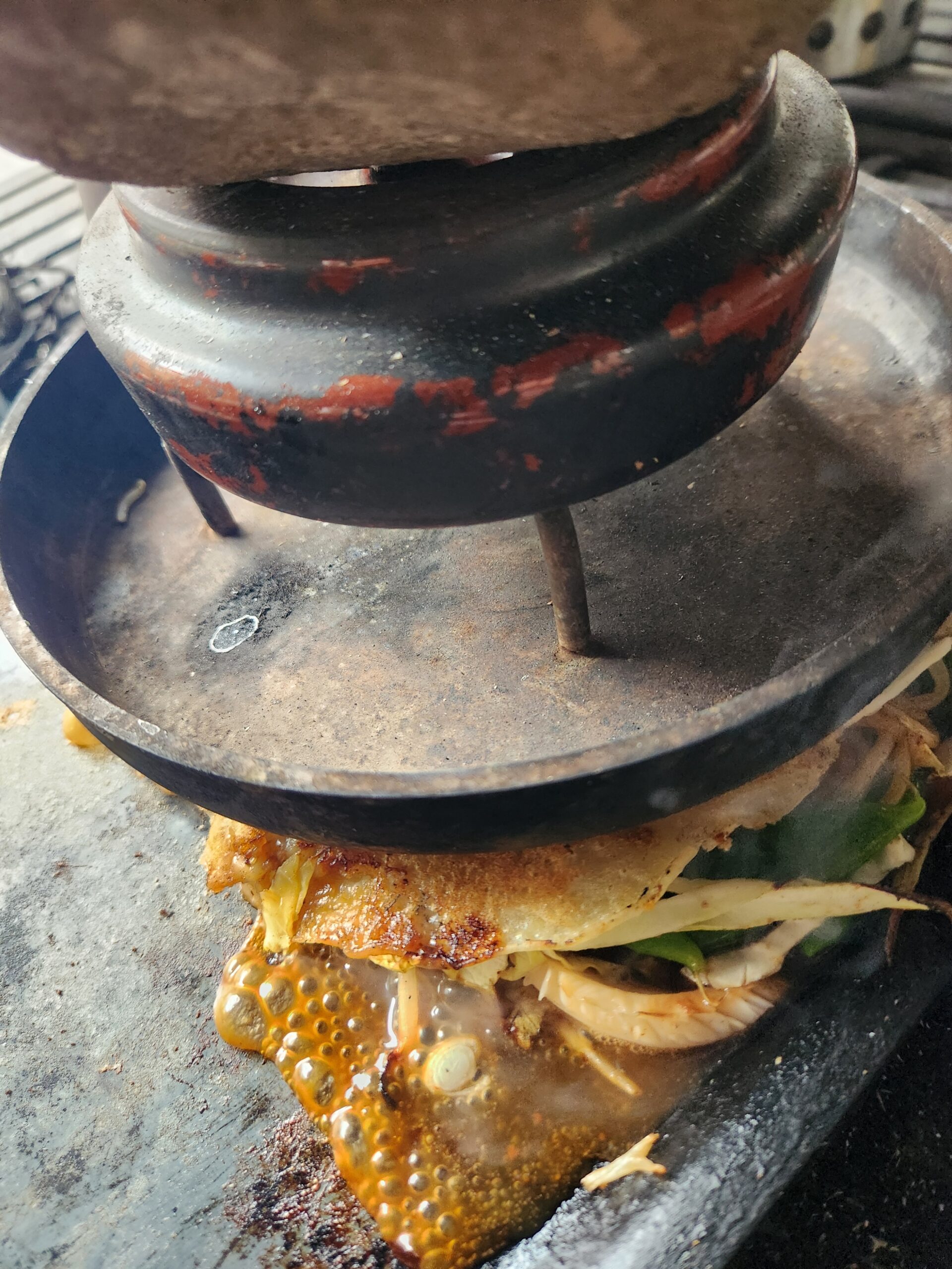 その上からダッチオーブンのフタでプレスし漬物石を乗せます(笑)