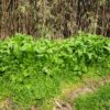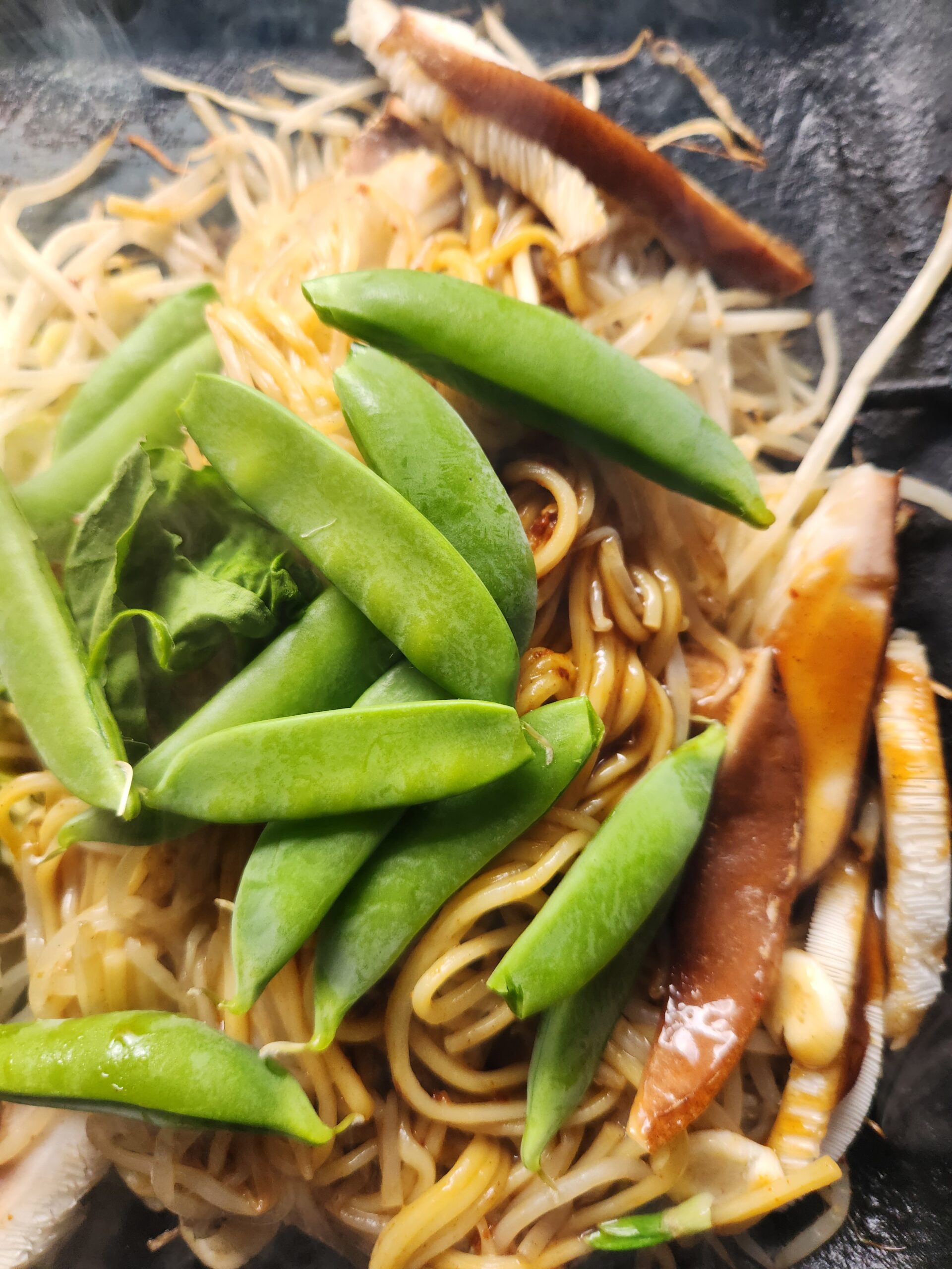ニンニクを3片ほど切って入れ、今うちに生えてるえんどう豆と原木椎茸を入れました。