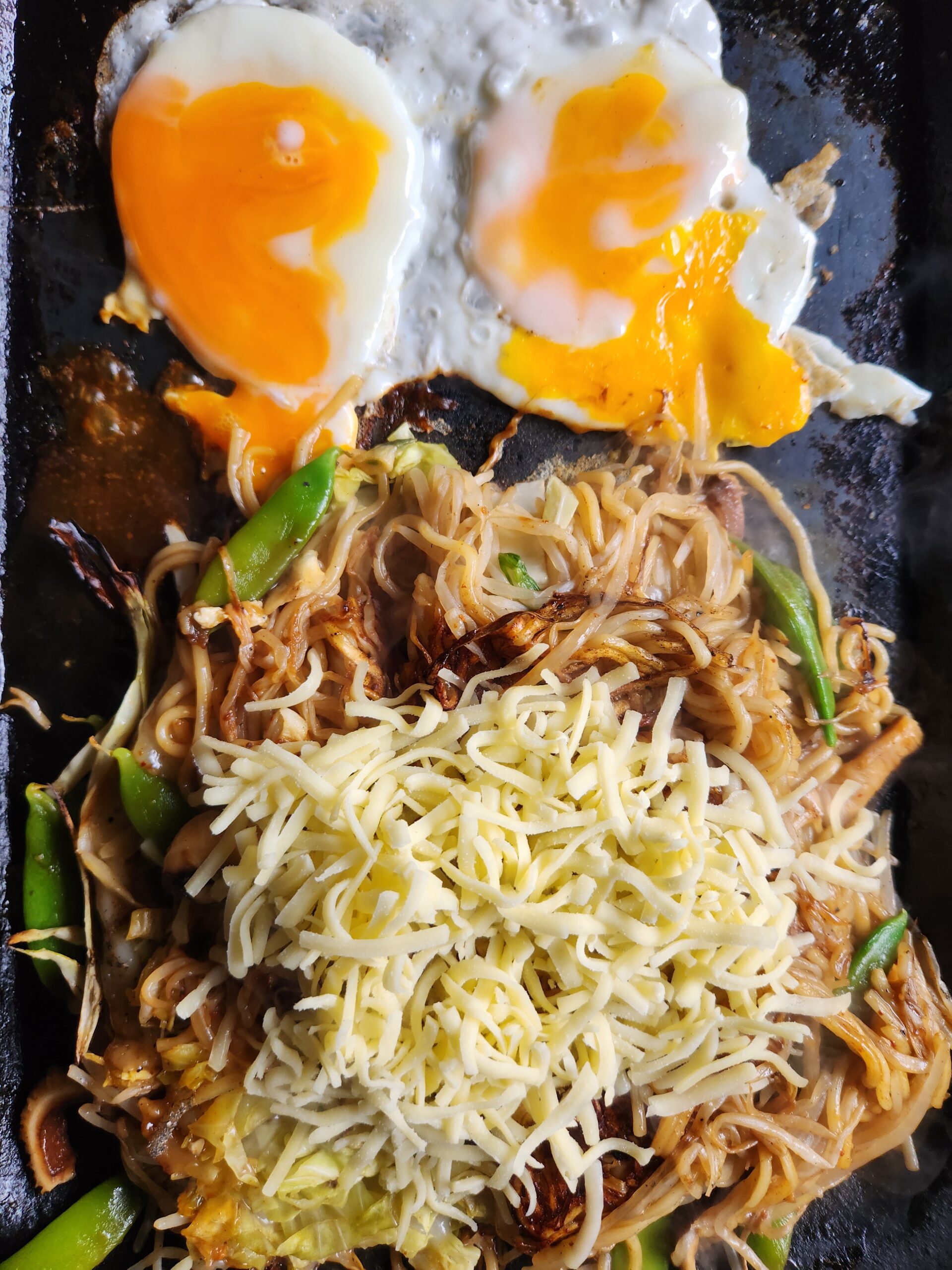 横で卵をやきはじめ半熟になったら、お好み焼きをひっくり返しそば面を上にします、チーズを乗せます。(チーズも私の好み、オプションです)